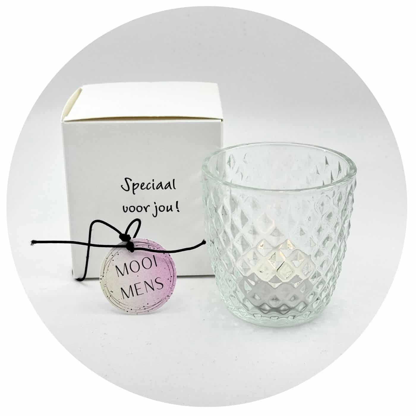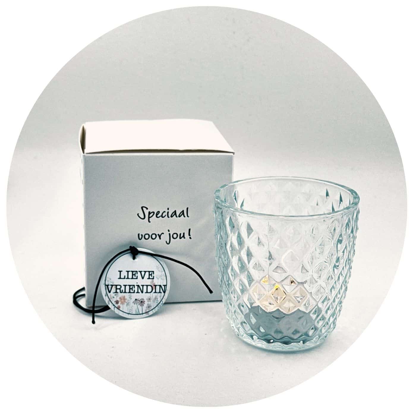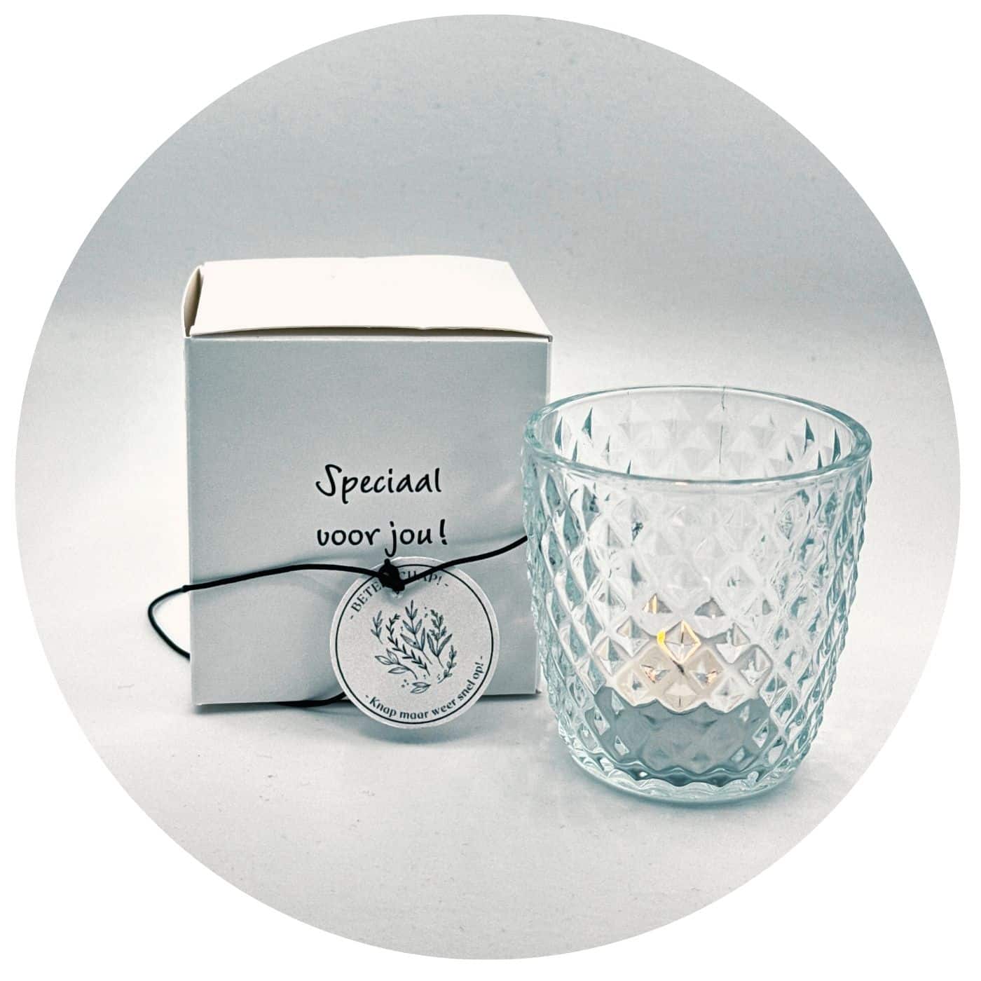 Het zachte schijnsel van glas en kaars maakt ruimte voor rust en verbinding. Het verborgen zinnetje verschijnt als een klein moment van magie. Een mooi gebaar om te schenken bij moeilijke dagen, als steuntje in de rug bij herstel, of als liefdevolle attentie voor iemand die dierbaar is. Even laten weten: er wordt aan je gedacht.