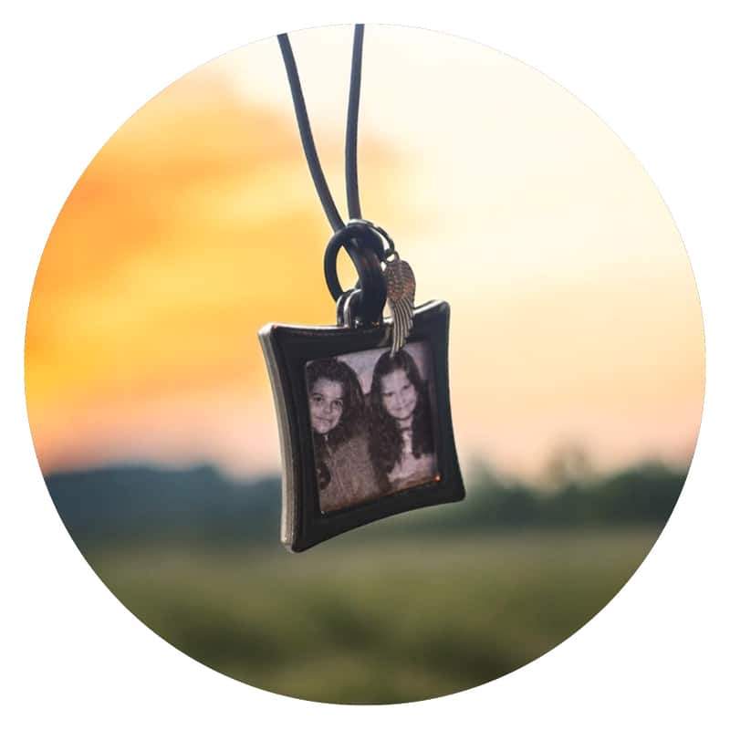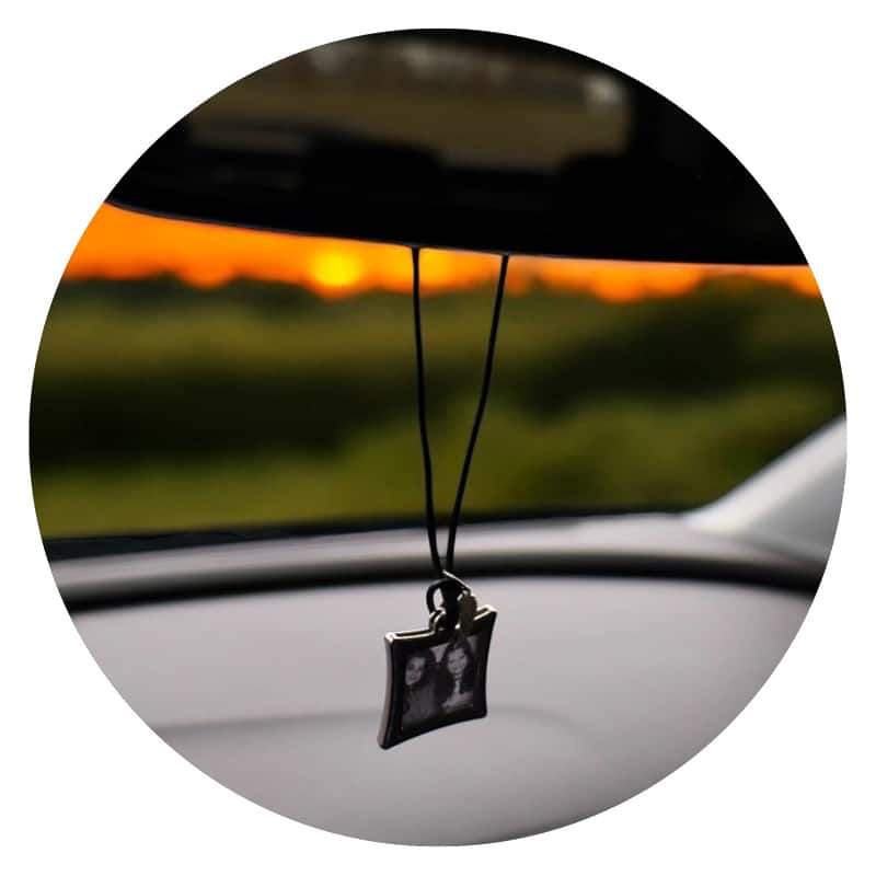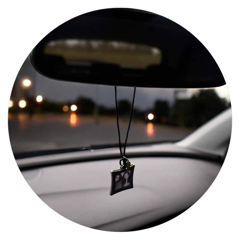Met die nostalgie in gedachten zijn deze leuke binnenspiegelhangers ontstaan. Het is een rubberen kettinkje waaraan een klein fotoframe hangt, waar je een fotootje van je dierbaren in kunt doen. Maar als het nodig is, kan het logo van de favoriete voetbalclub natuurlijk ook! Tevens hangt er een klein vleugeltje aan, met de gedachte erachter dat af en toe een engeltje op je schouder geen kwaad kan.