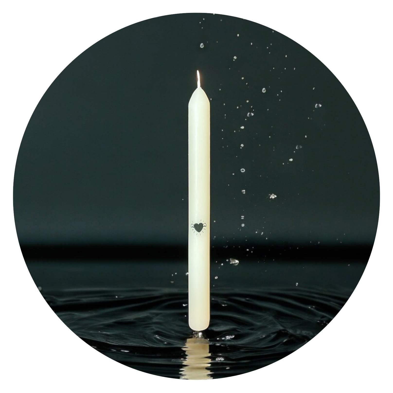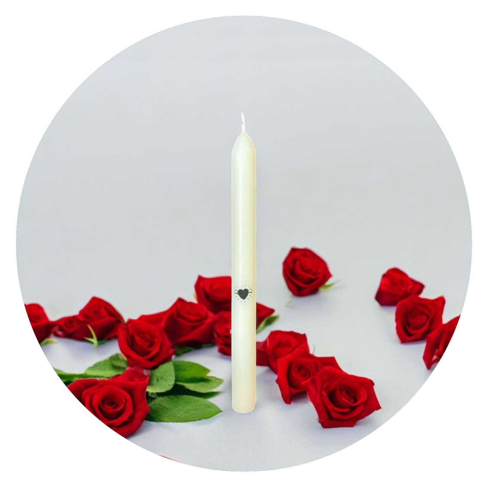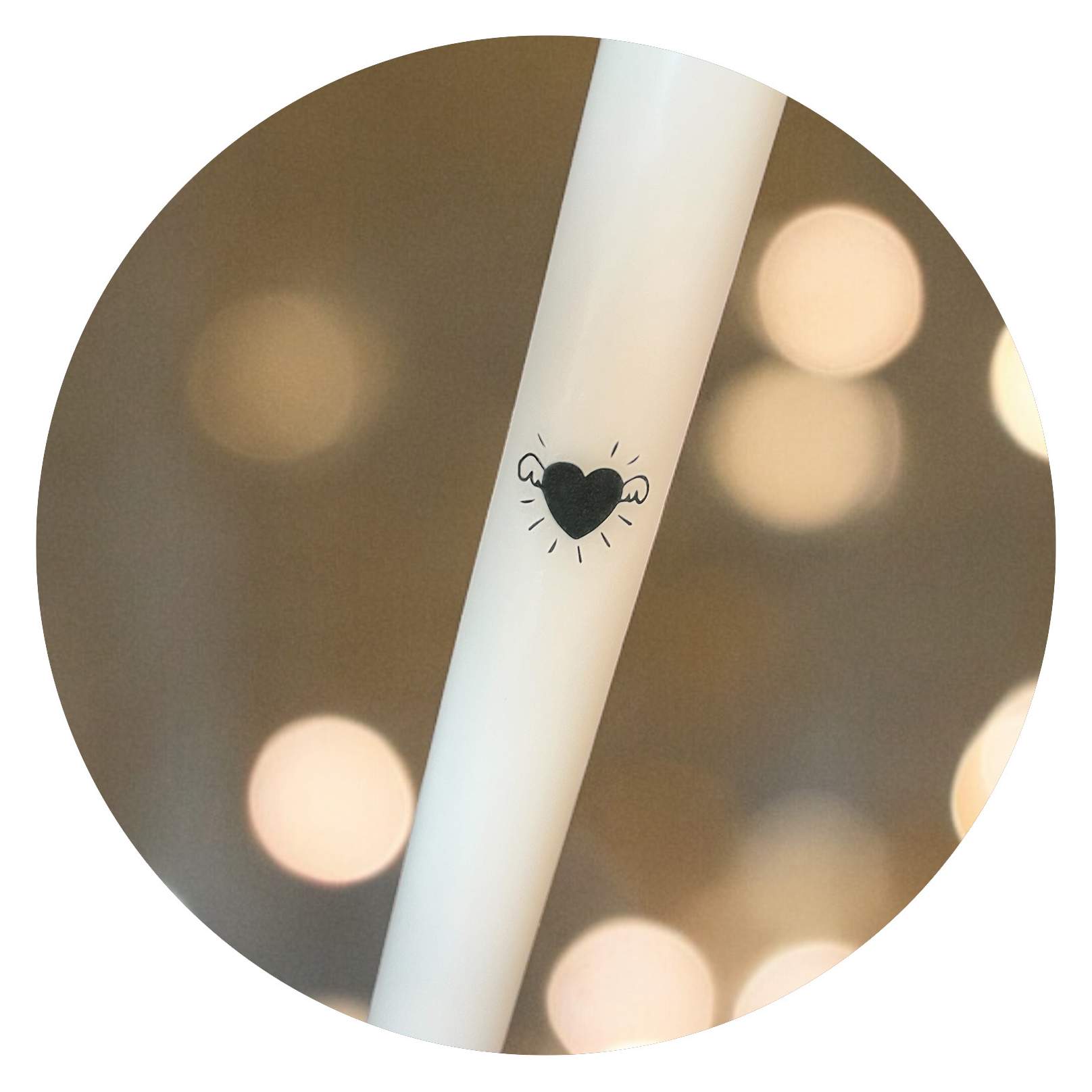 Deze prachtige gladde kaars is maar liefst 23 centimeter hoog en brandt zo’n acht uur. Halverwege zijn ranke lijf vind je een lieve afbeelding van een hartje met vleugeltjes.