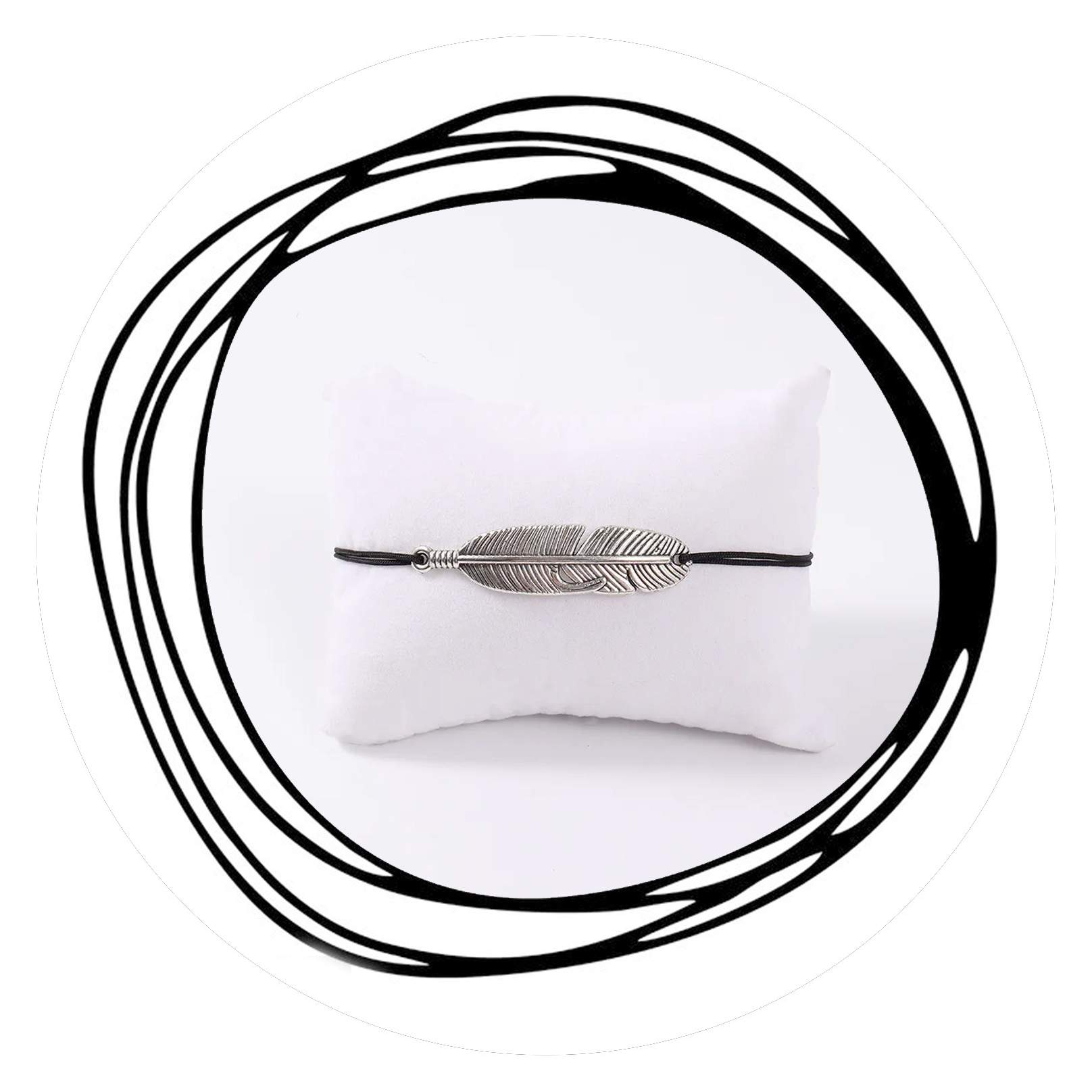 Een stoer maar eenvoudige armband, gemaakt van een zwarte veter met ertussen een veertje. De armband is aan de achterkant verstelbaar en gaat tot ongeveer 28 centimeter.