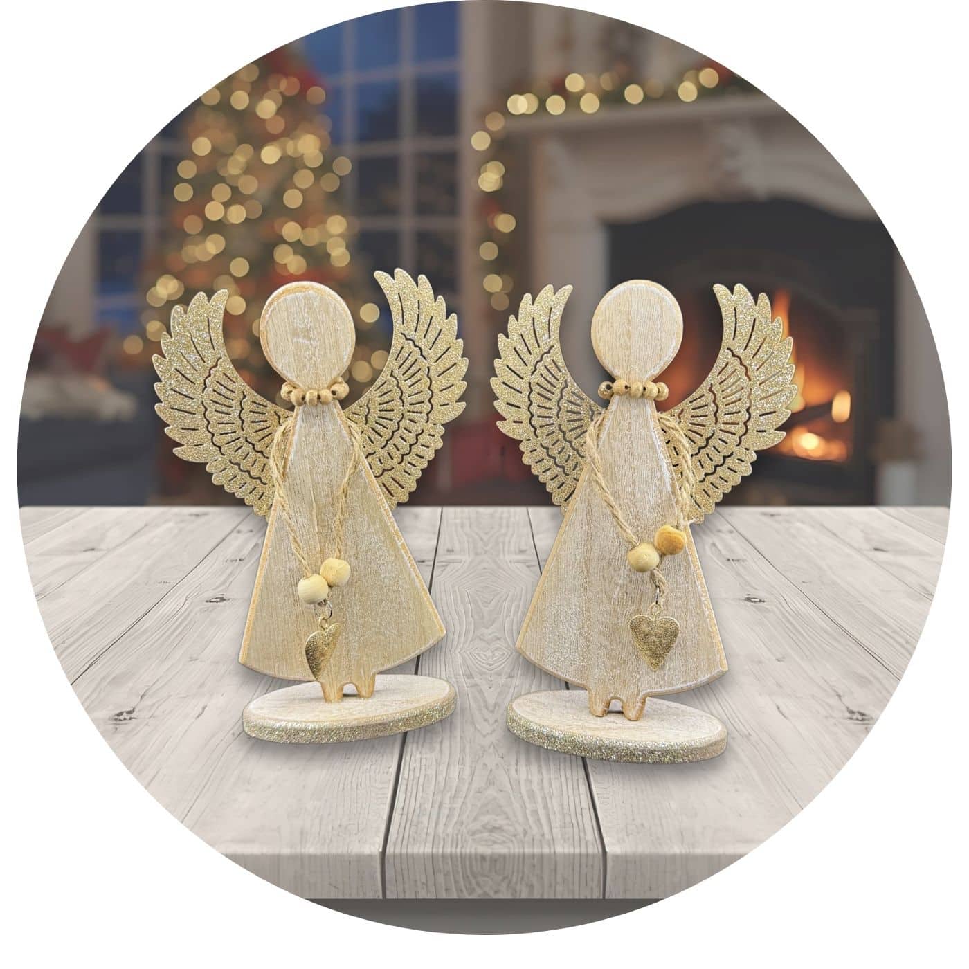 De houten engel met gouden vleugels is apart verkrijgbaar of als set van twee. Twee engelen kunnen bijvoorbeeld symbool staan voor twee dierbaren, of voor de band tussen gever en ontvanger.