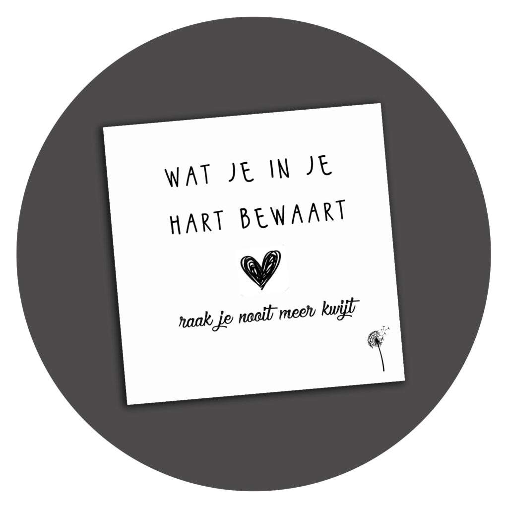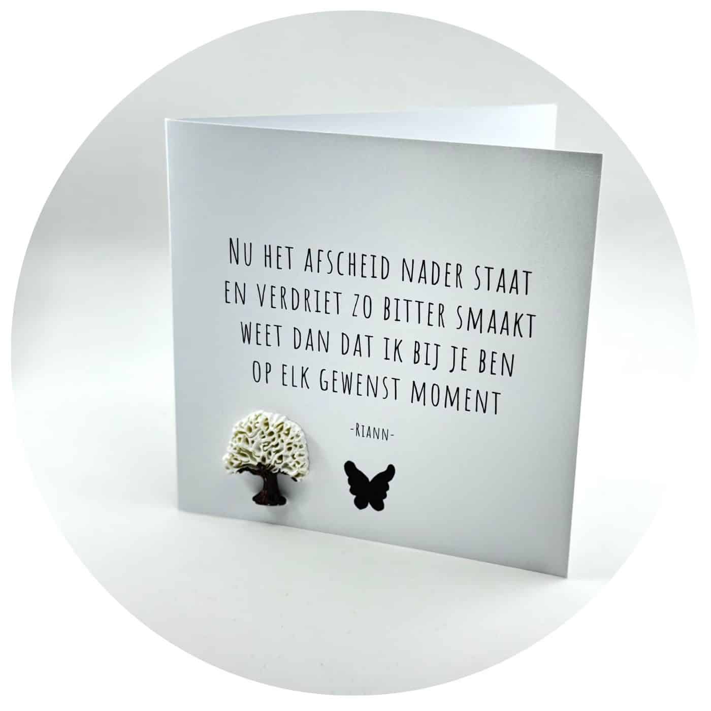 - Voorzijde met troostrijke tekst en subtiele symboliek (geluksbrenger in de vorm van een boom)