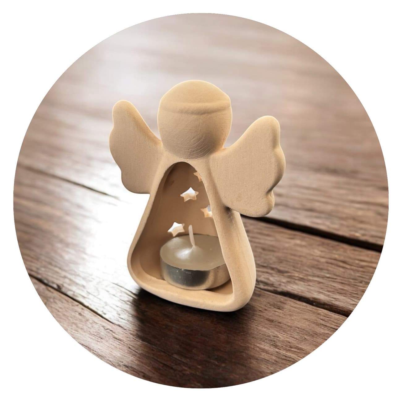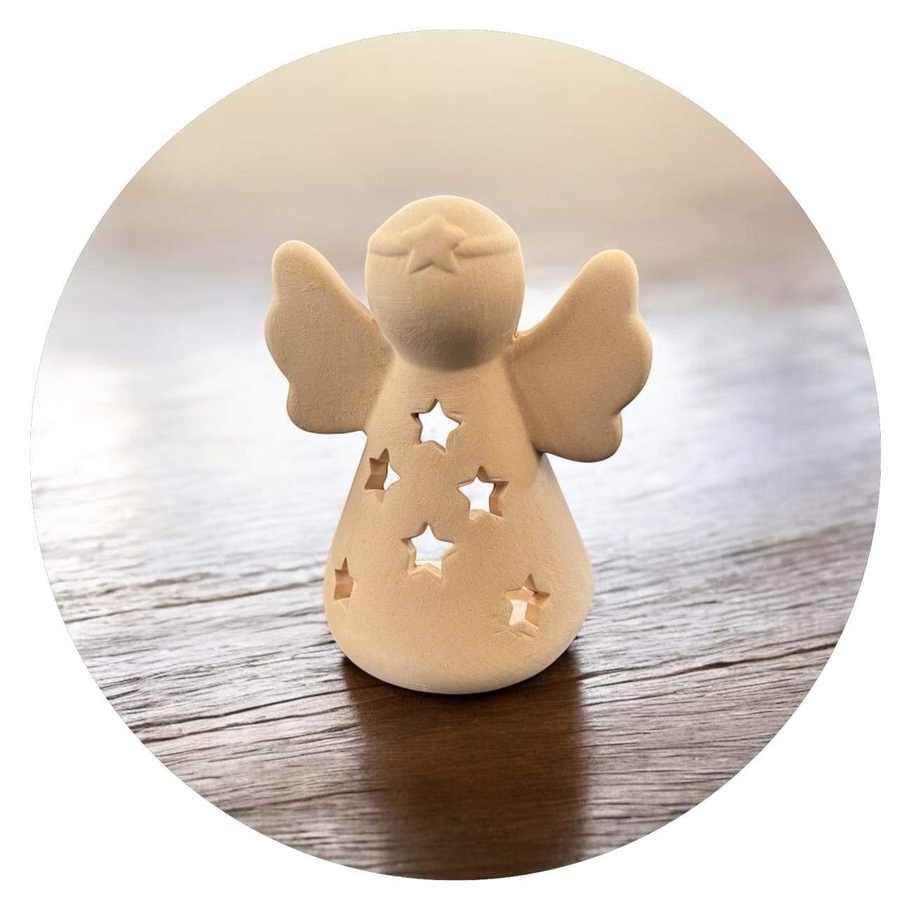 Dit prachtige keramieken engeltje is niet zomaar een decoratie, maar een warm lichtpuntje in huis. Binnenin is ruimte voor een waxinelichtje. Zodra je het kaarsje aansteekt, schijnt het zachte licht door de kleine uitsparingen in de vorm van sterretjes. Dat geeft een betoverend effect: een engel die straalt en een kamer vult met warmte en rust.
