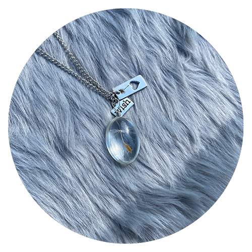 In deze ketting zit zo’n pluisje, hij is tijdens het glasblazen meegenomen en zit dus in het glas vast. Aan de ketting zit tevens het woordje ‘wish’ en een zilverkleurig label waaruit een hartje is gesneden en het pluisje uit ons logo is gebrand. Omdat het echte paardenbloempluisjes zijn, is ieder artikel uniek en zijn er kleine verschillen mogelijk ten opzichte van de afbeelding.