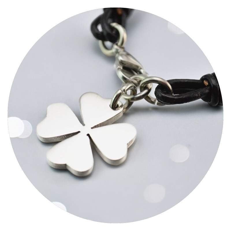 Een stoere, leren armband, ik kan niet anders zeggen. Met de dubbele leren koordjes en de grove knoop maak je al indruk, maar de prachtige, glanzende klaver vier is ook een enorme blikvanger.