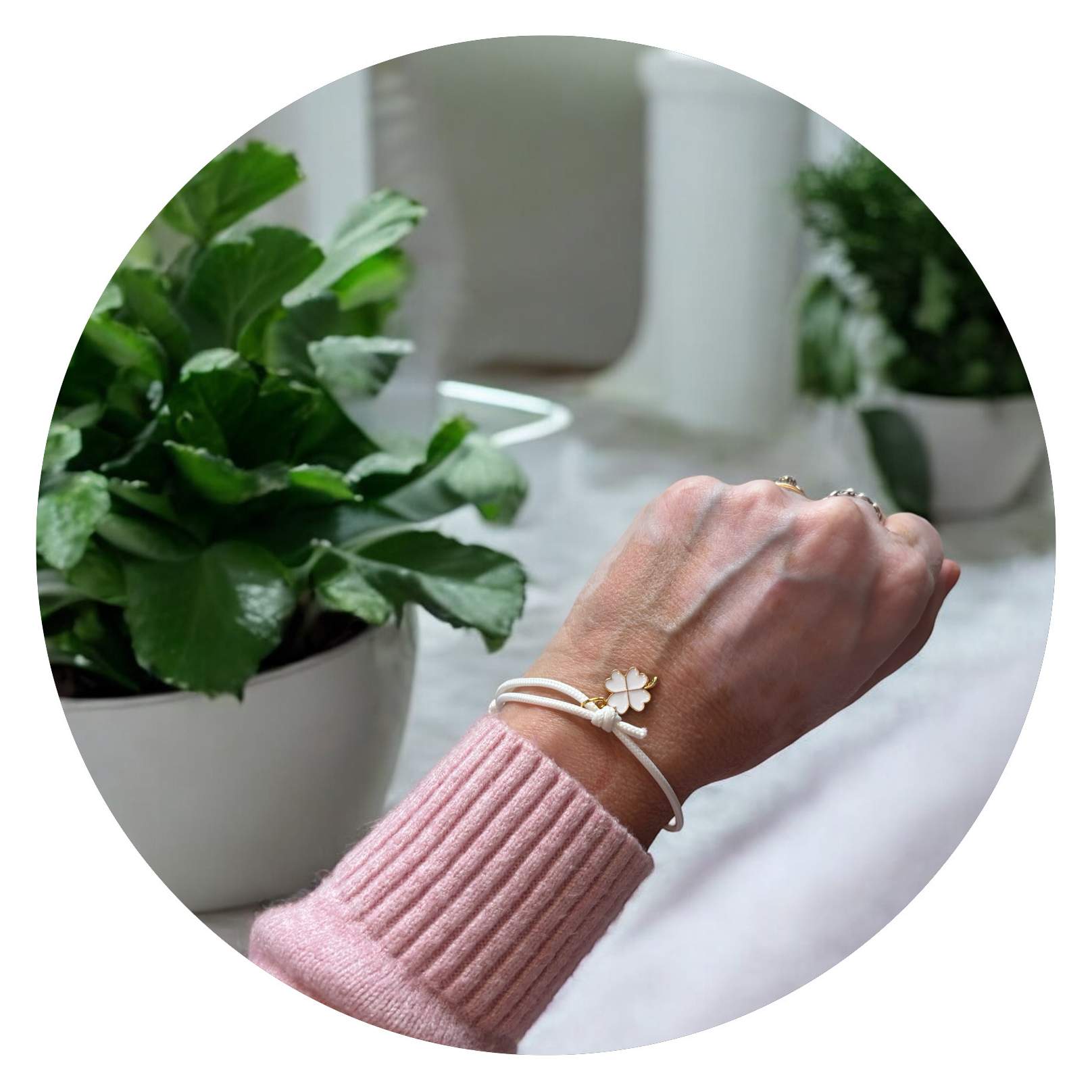Een eenvoudig verstelbaar wit vetertje met daaraan een goudkleurig bedeltje in de vorm van een klavertje vier, ingekleurd met zwart, wit of groen. Inderdaad, een klavertje vier, waardoor je weet dat geluk binnen handbereik ligt!