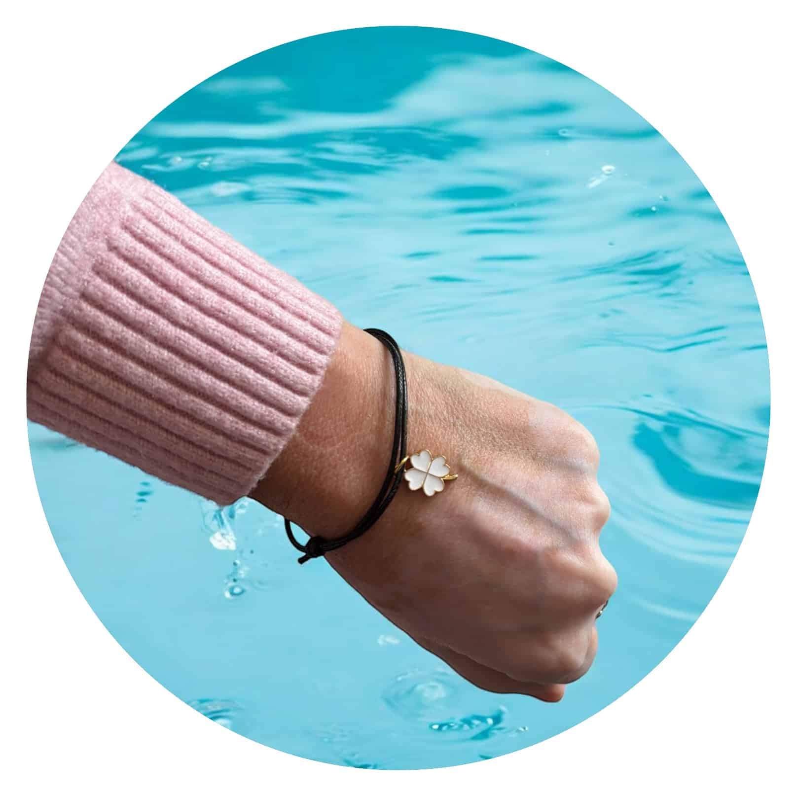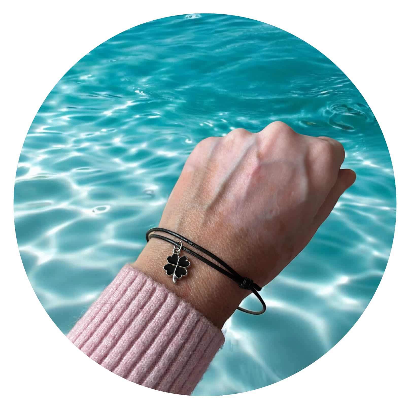 Een lief verstelbaar zwart vetertje met daaraan een goud- of zilverkleurig bedeltje in de vorm van een klavertje vier, ingekleurd met zwart, wit of groen. Exact, een klavertje vier, waardoor je weet dat geluk binnen handbereik ligt!