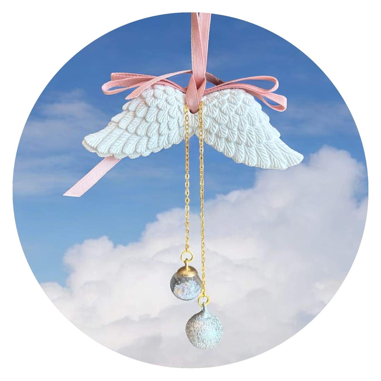Deze stevige, redelijk zware hanger, bestaat uit twee witte, gevederde vleugeltjes die zachtjes wiegen aan een oudroze lintje. Aan de gouden kettinkjes bungelen een klein zilverkleurig belletje en een transparant bolletje, gevuld met witte glittersterretjes.