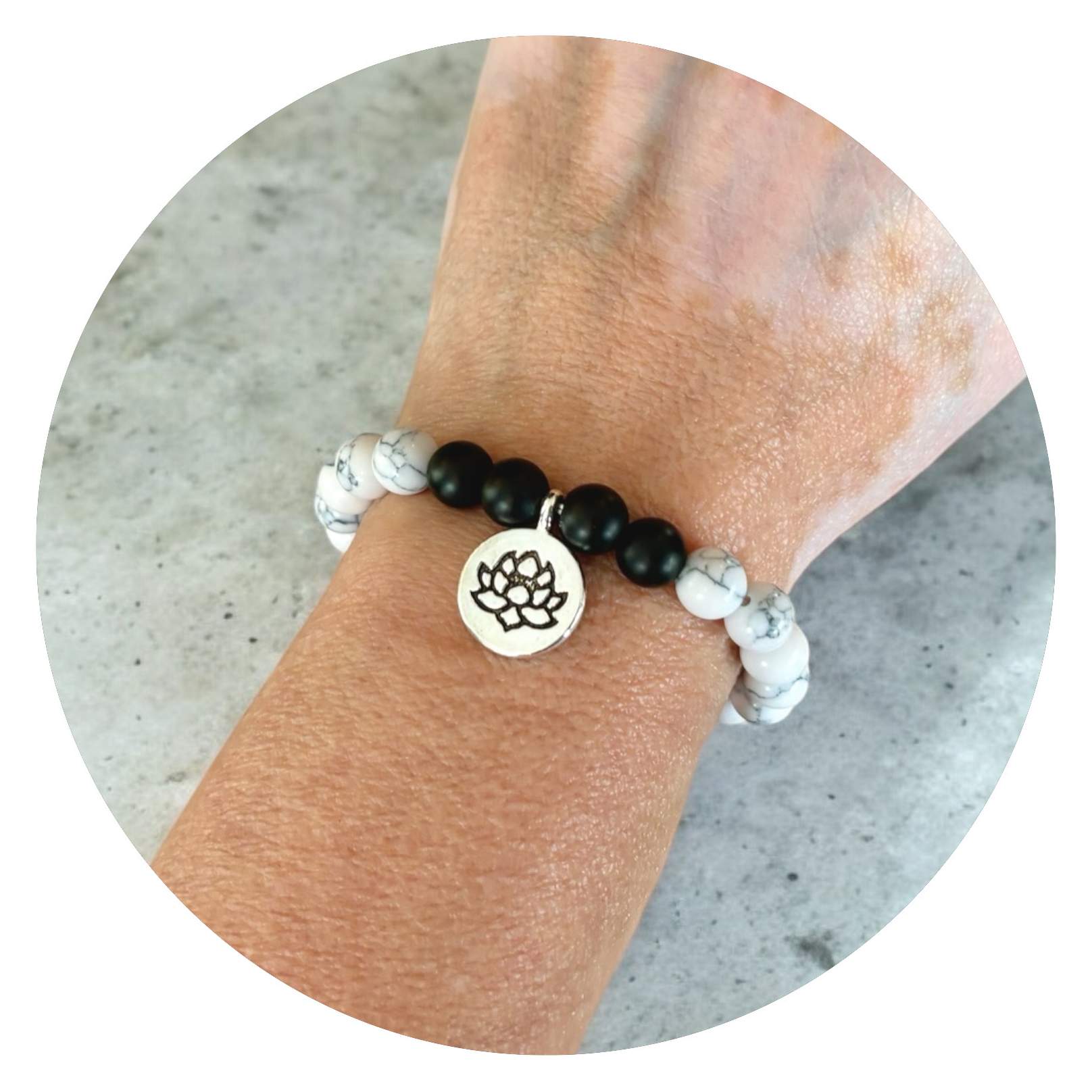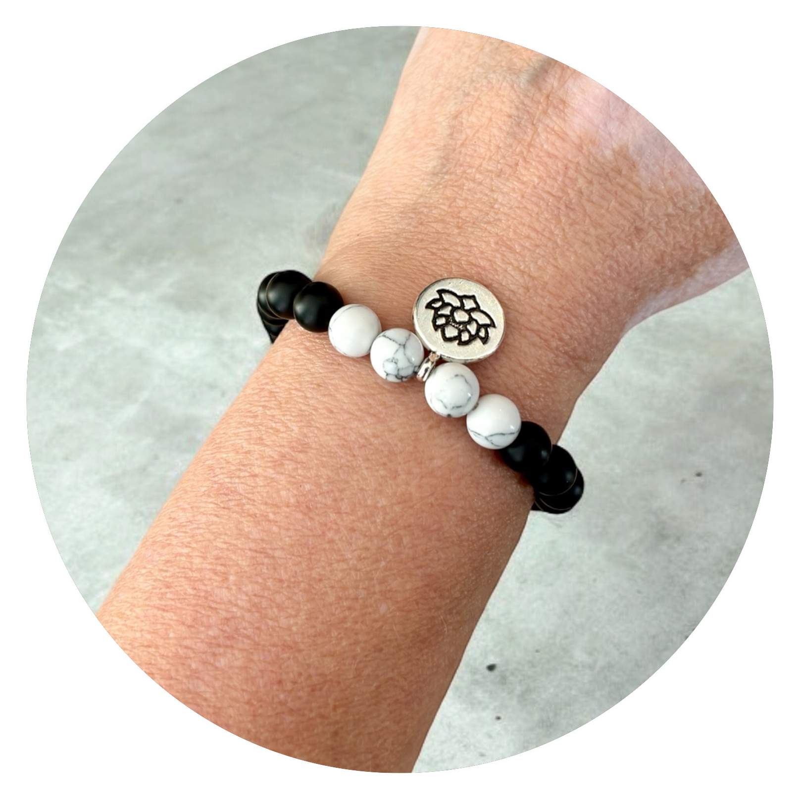 Wit met een vleugje zwart, of zwart met een sprankje wit—je weet dat het leven altijd om balans draait. Of je nu een witte dag hebt met een klein wolkje, of een donkere dag met een straaltje zon, deze armbanden helpen je de balans te vinden. En als extraatje hangt er een lotusbloem bij, een subtiel symbool van groei en veerkracht. Perfect voor iedereen die af en toe een zachte herinnering nodig heeft: het komt altijd goed, zelfs als de boel een beetje in de knoop zit… (net als je armbandje soms).
