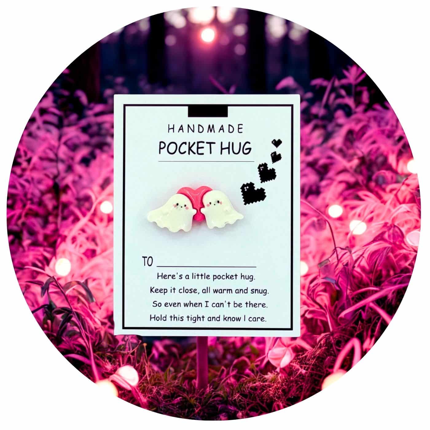 Een teder gebaar in mini-formaat. Op dit kaartje staan twee kleine, vriendelijke spookjes dicht tegen elkaar aan, met tussen hen in een zachtroze hart. Samen vormen ze een Pocket Hug: een symbolisch knuffeltje dat overal mee naartoe kan.