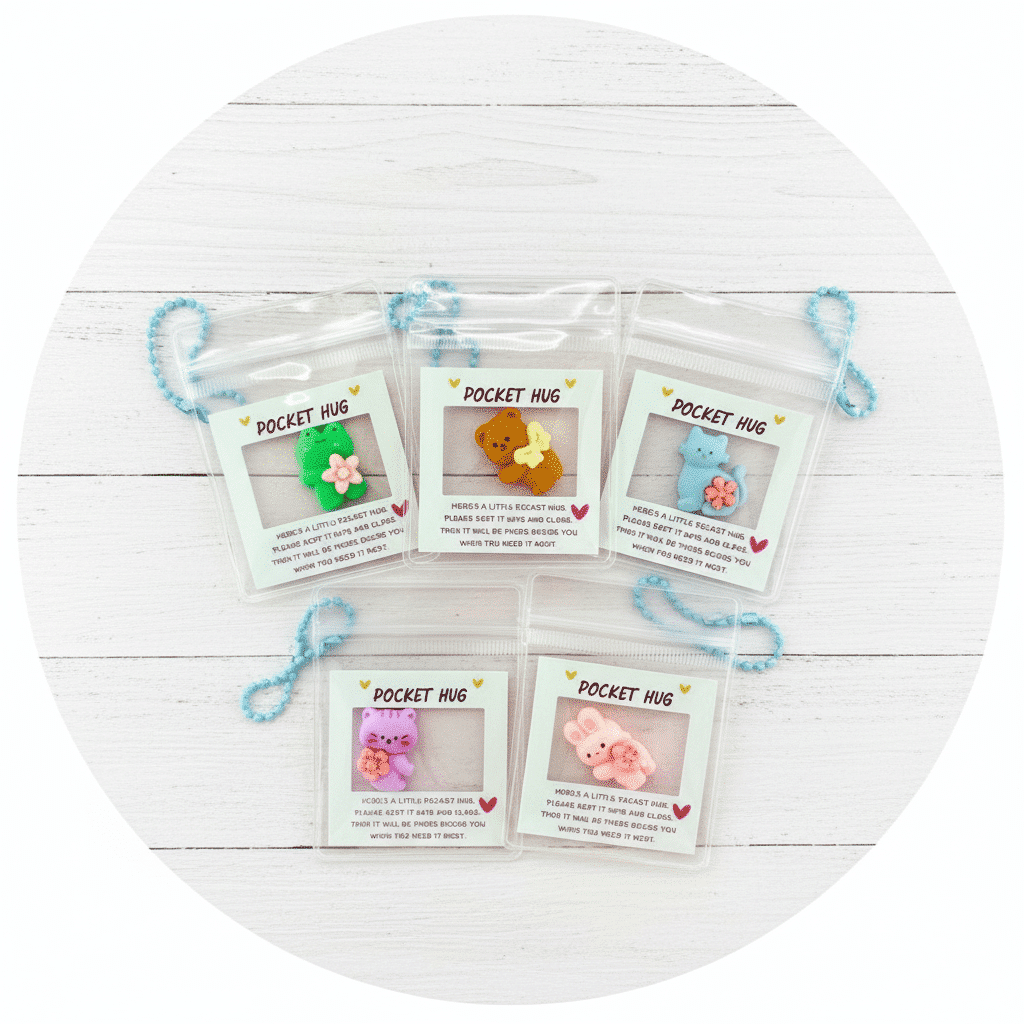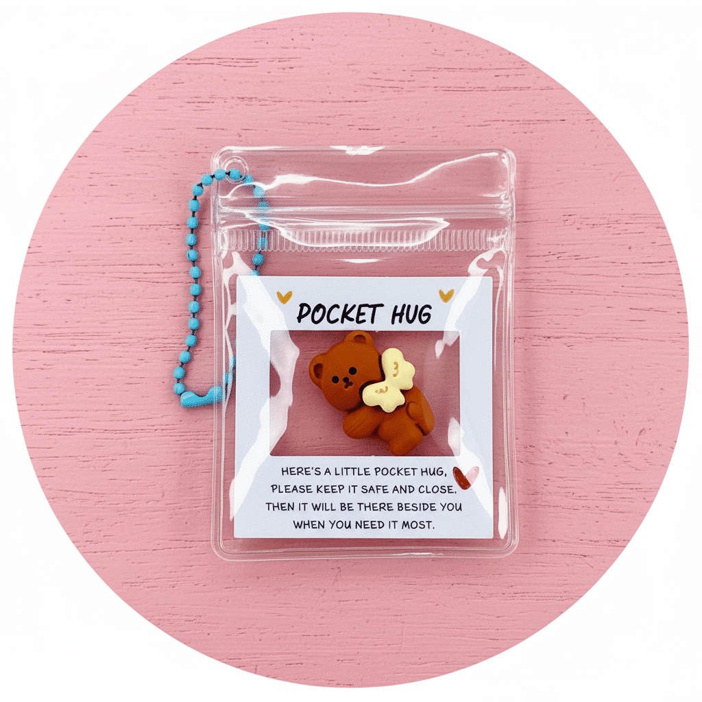 Een kleine knuffel voor onderweg, verpakt in een transparant pvc tasje met een lief kaartje: deze Pocket Hug sleutelhanger is een tastbare herinnering dat er aan jou gedacht wordt. Aan een sleutelbos, rits van een tas, etui of jaszak; het diertje blijft steeds binnen handbereik als stil steuntje in de rug.