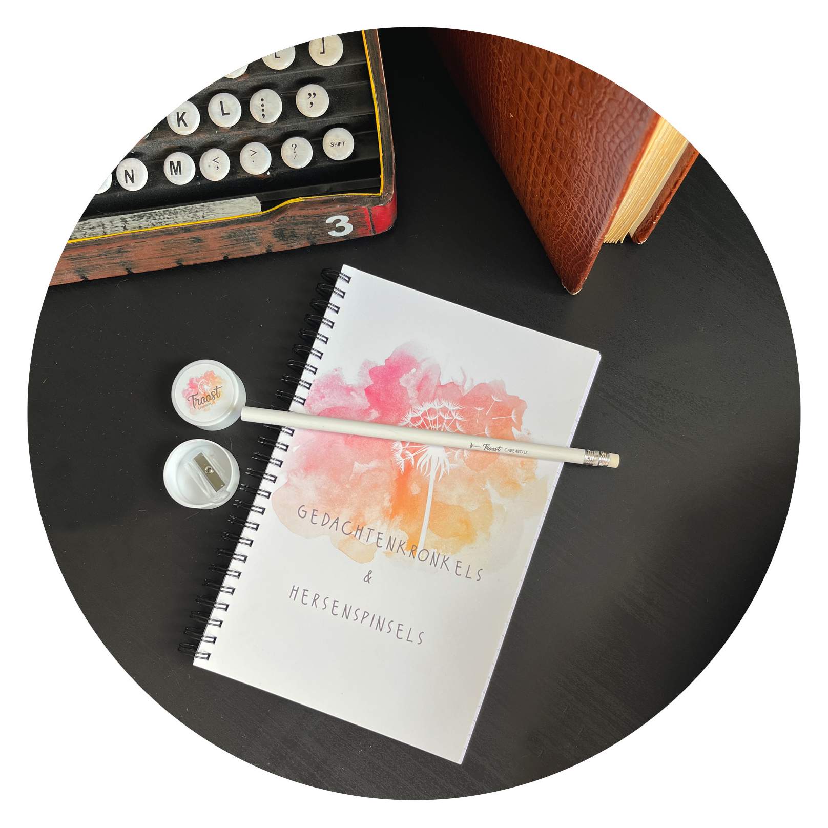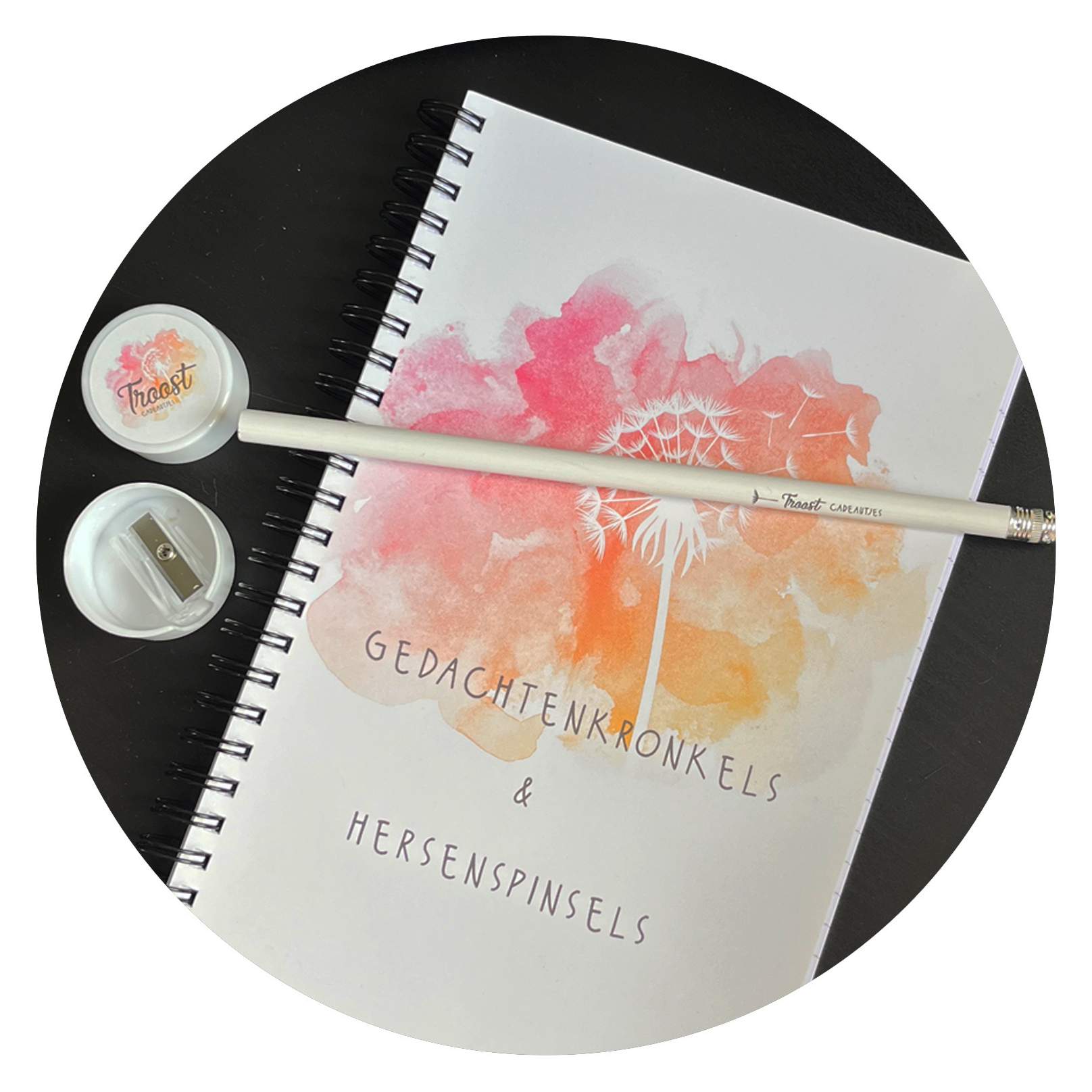 Met het notitieboekje, het bedrukte potlood en de puntenslijper heb je een complete set die ook feestelijk ingepakt wordt geleverd. Een uiterst geschikt cadeautje voor wie letterlijk veel aan zijn hoofd heeft.