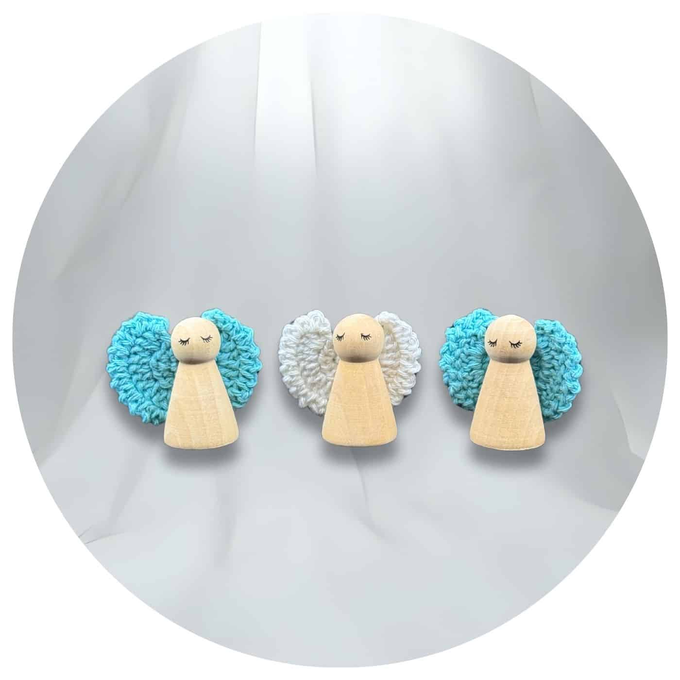 Deze set van 3 houten engeltjes met gehaakte vleugels stralen rust en tederheid uit. Hun gesloten oogjes en zachte uitstraling geven een gevoel van stilte en nabijheid. De gehaakte vleugels van katoendraad, in wit en verschillende tinten blauw, maken van ieder engeltje een klein, liefdevol detail.