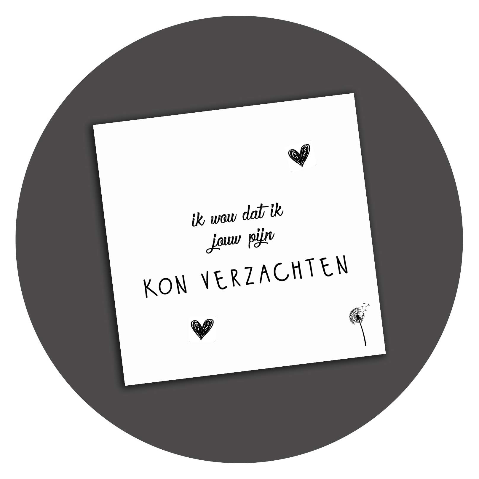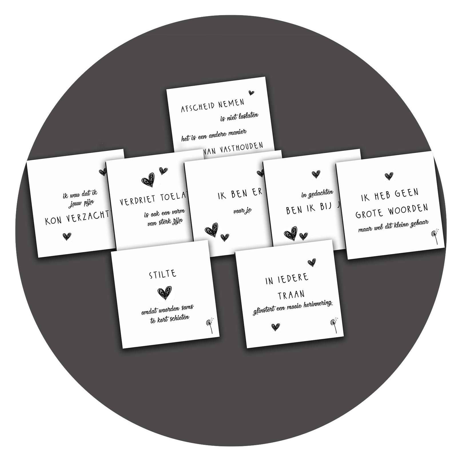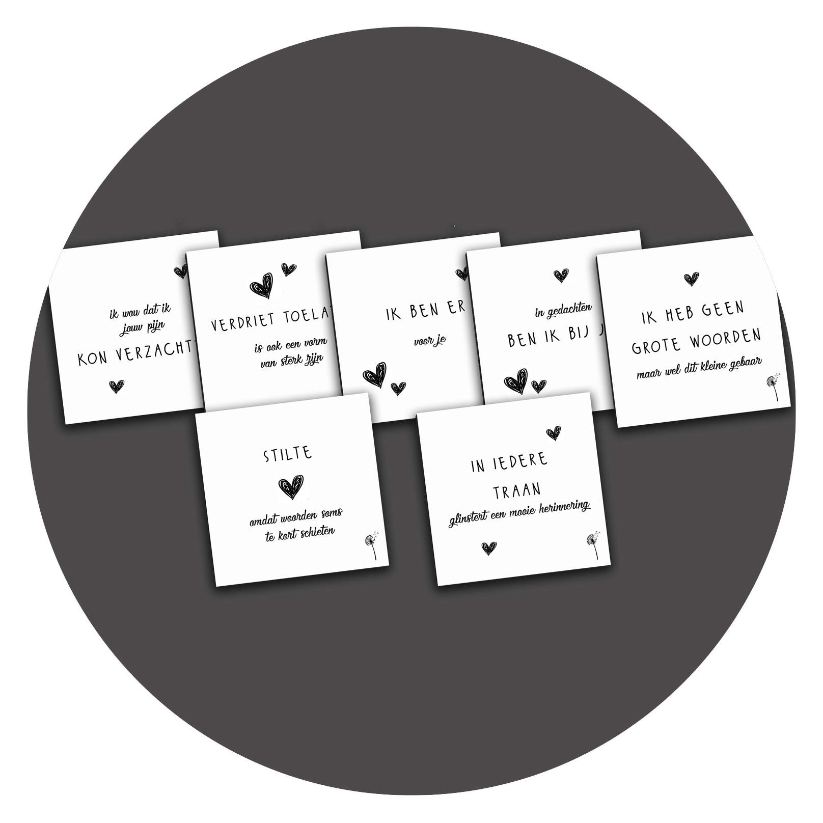 Speciale Troostset: 8 lieve zwart-wit kaartjes met voor zichzelf sprekende teksten. De achterkant van deze kaarten zijn volledig blanco, waardoor je daar je eigen boodschap kunt schrijven. De kaartjes zijn heel geschikt als cadeaukaartje bij een presentje, maar passen ook in een standaardenvelop mocht je hem willen versturen.