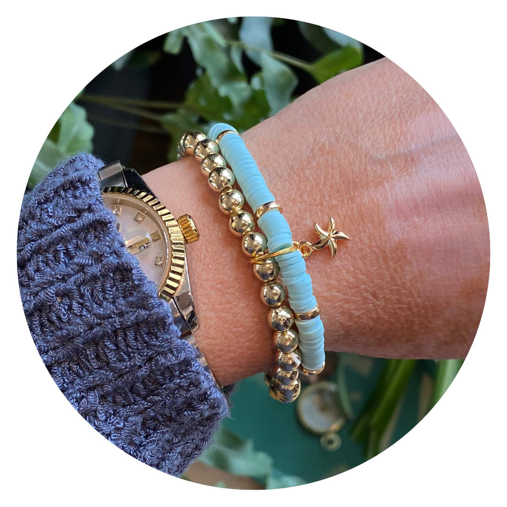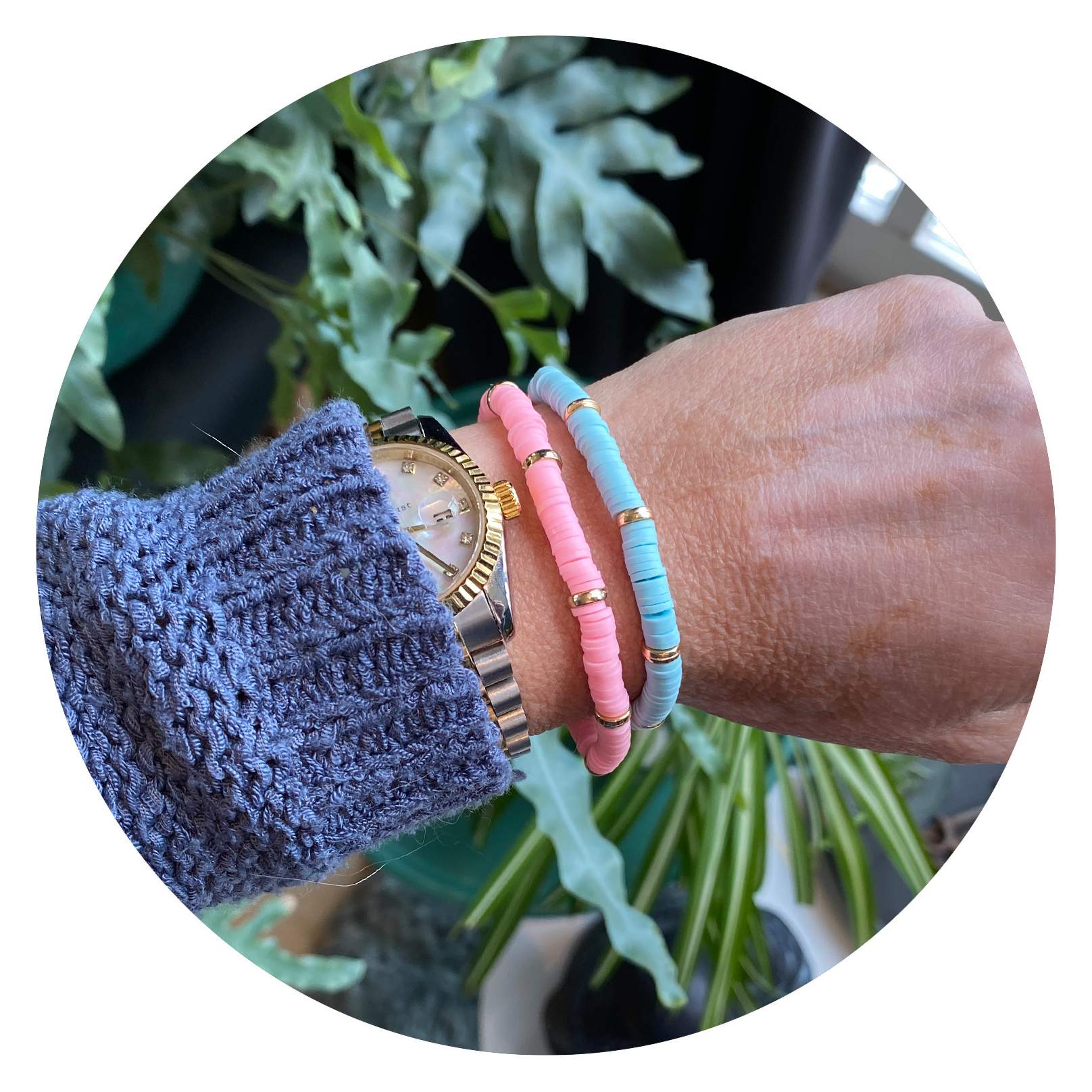 Een prachtige, lieve set armbandjes bestaande uit een armbandje met goudkleurige ronde kralen en een armbandje met platte, siliconen kralen in blauw of roze. Aan de set hangt een goudkleurig sterretje.