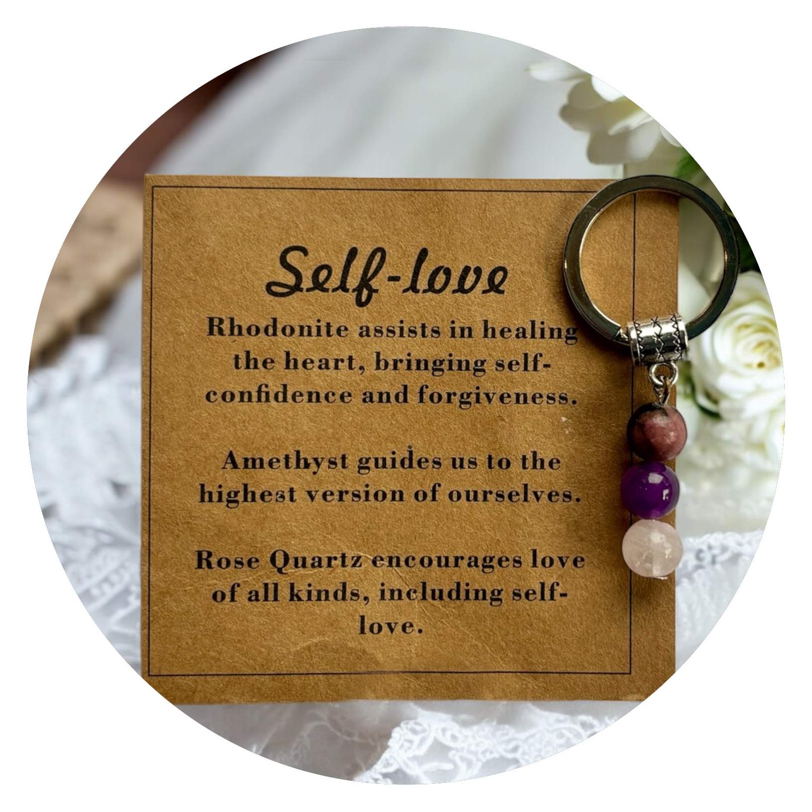 Aan de sleutelhanger met Self-love hangen uiteraard ook drie kraaltjes. Hier vond je de roze gemarmerde kraal Rhodoniet die zich hard maakt voor zelfvertrouwen en vergeving. De paarse Amethist helpt je te ontwikkelen en de zachtroze Rozenkwarts moedigt je aan lief te hebben, waar zelfliefde uiteraard ook onder valt.