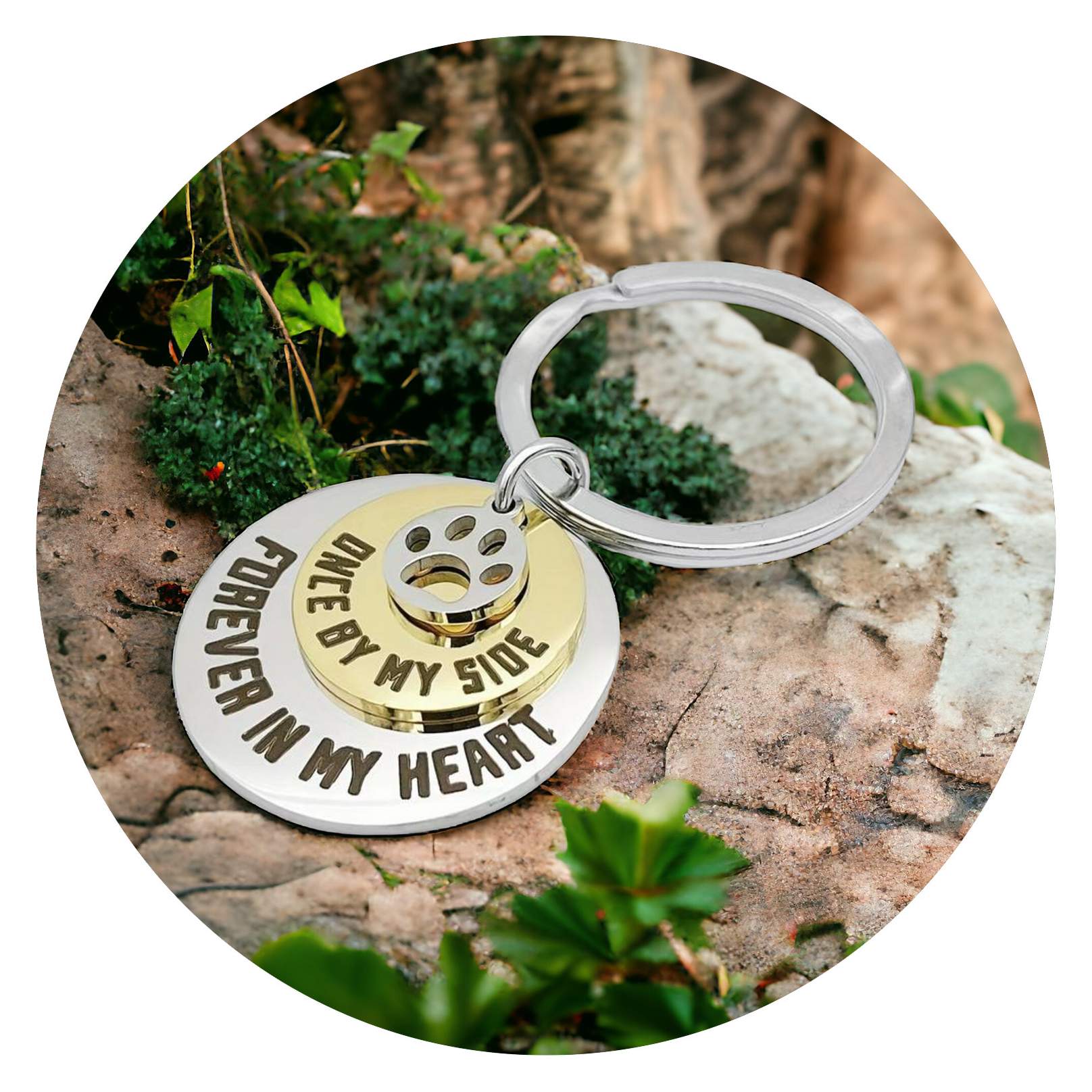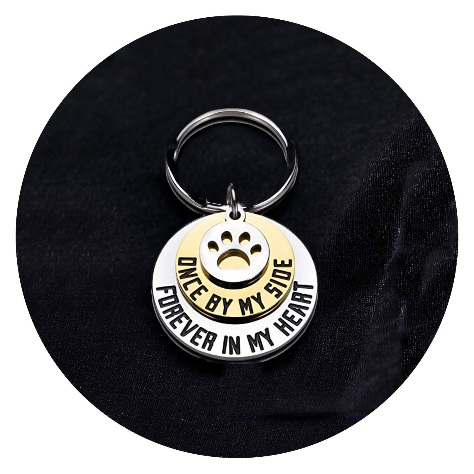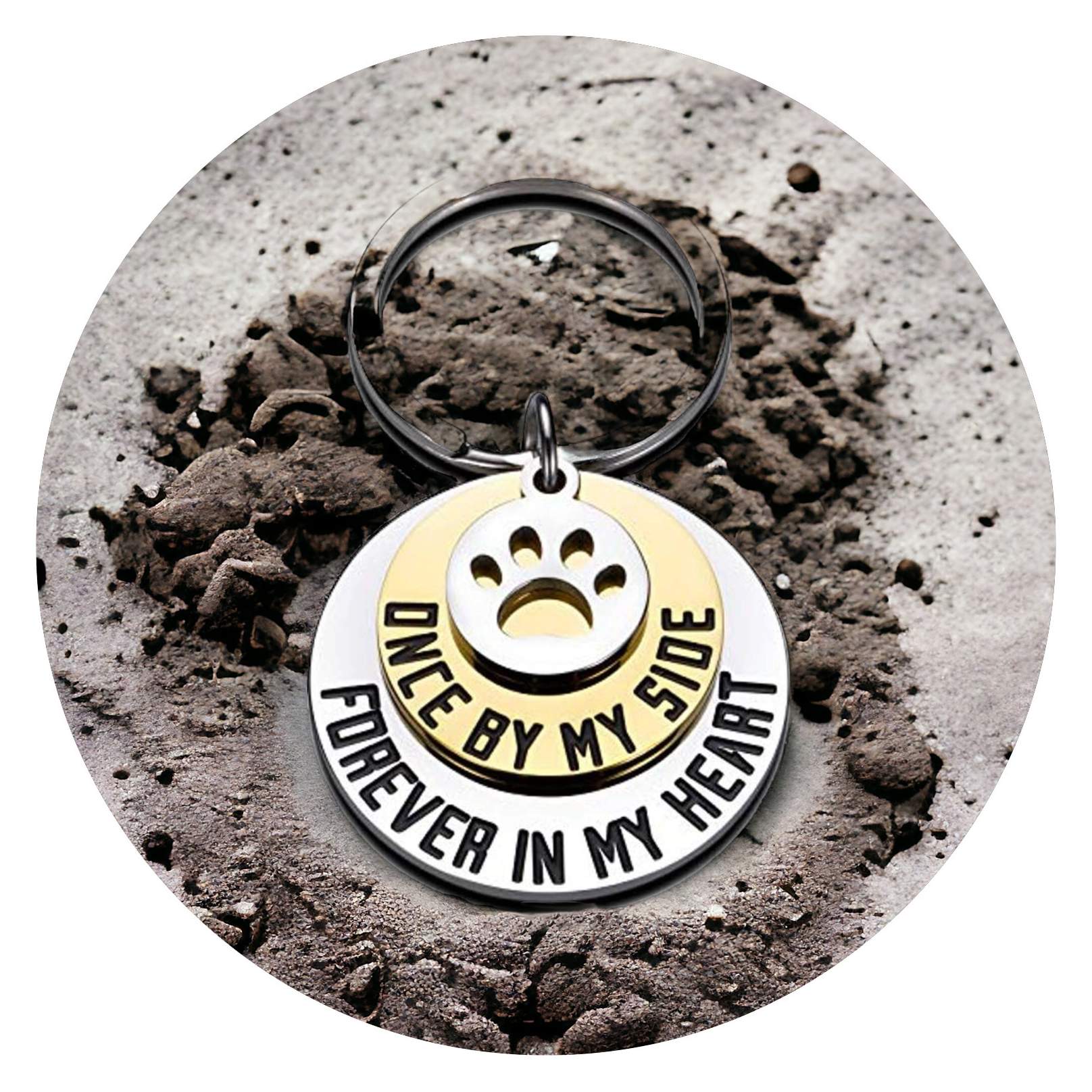Het is een bijzondere sleutelhanger, deze ring met verschillende cirkels. De bovenste laag heeft een bedeltje van een pootafdrukje. De cirkel eronder is goudkleurig en heeft de tekst ONCE BY MY SIDE en de zilverkleurige cirkel eronder, die iets groter is waardoor de teksten prachtig onder elkaar staan, bevat FOREVER IN MY HEART.