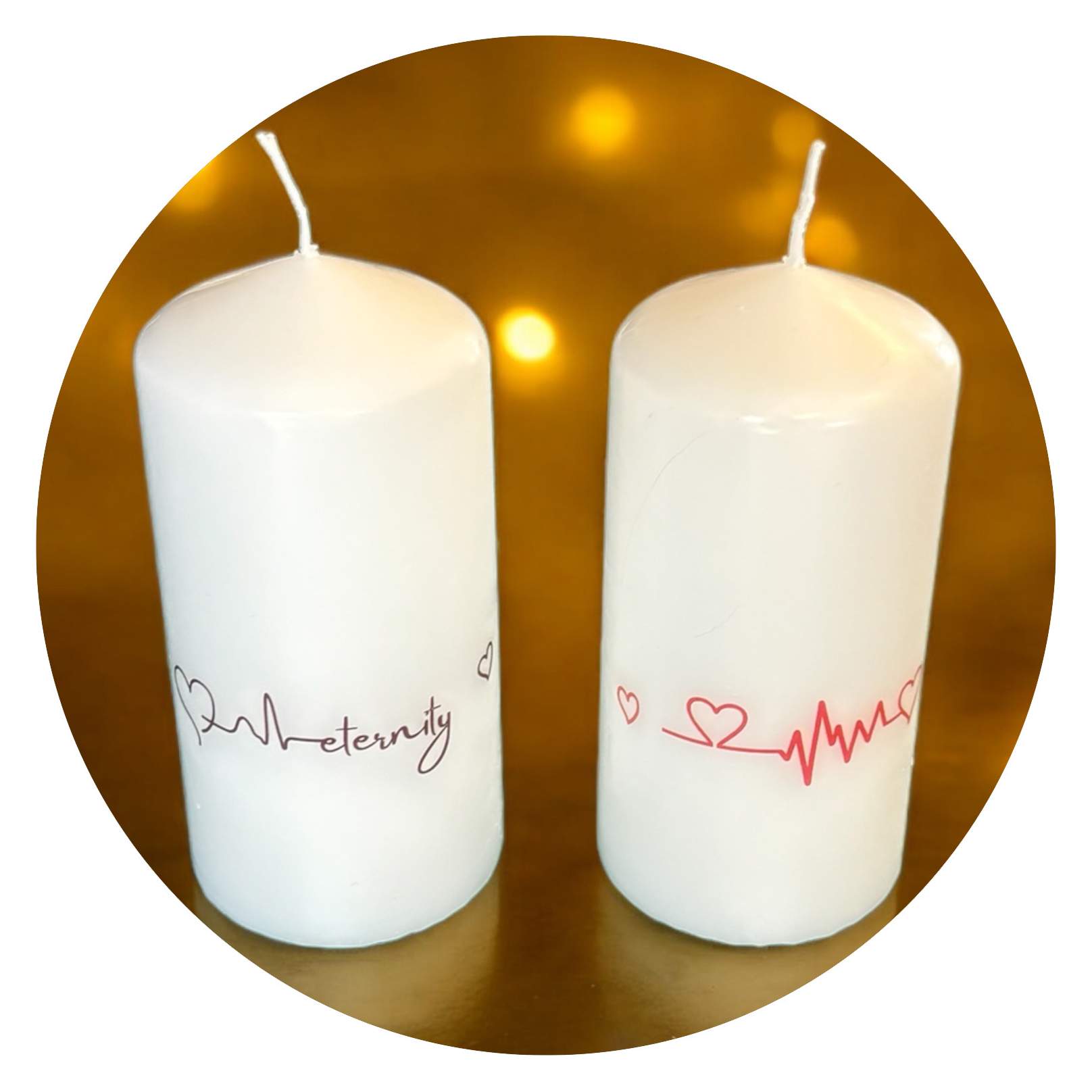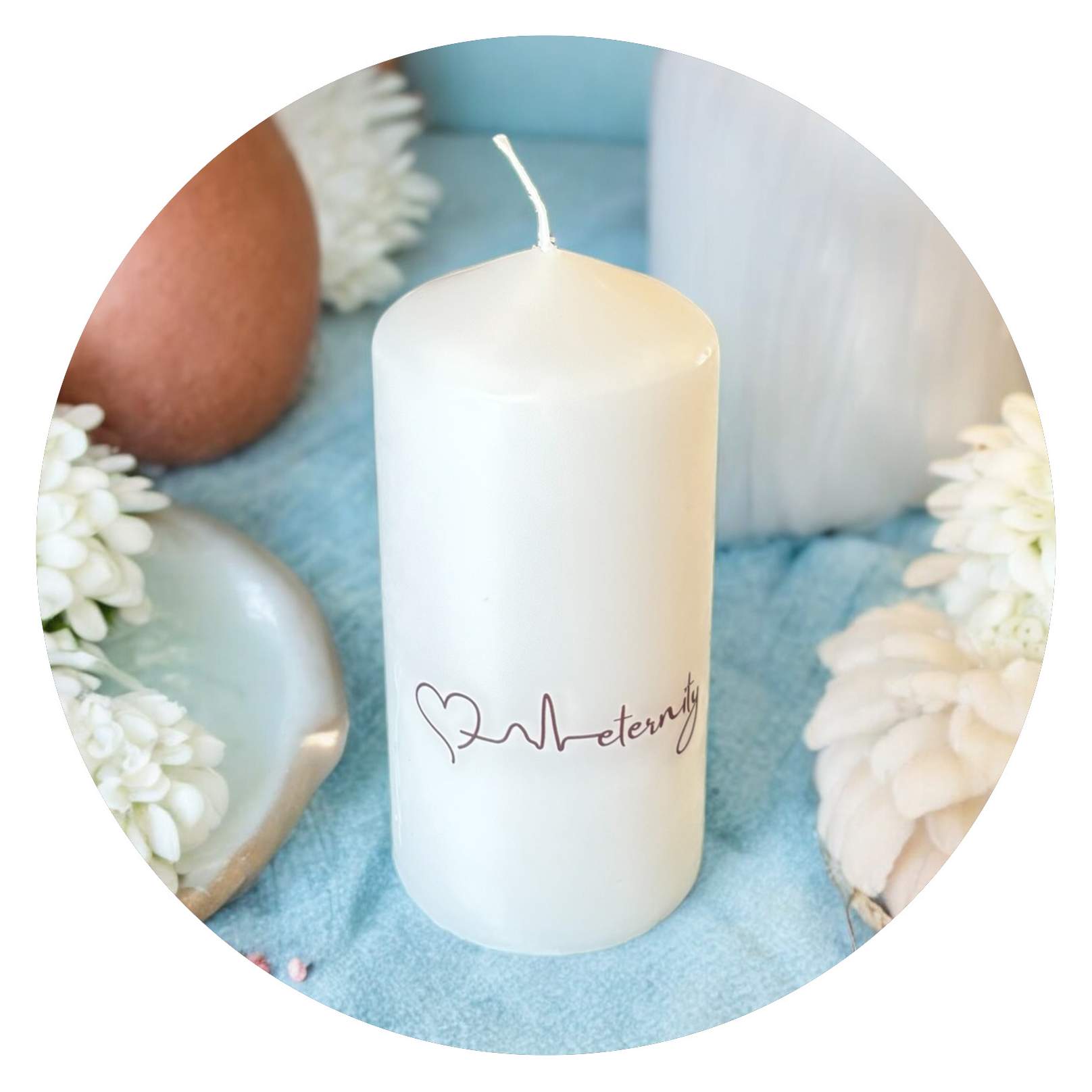 De kaarsen zijn er in twee uitvoeringen. De versie ETERNITY heeft een zwarte opdruk van twee hartjes en de tekst Eternity (eeuwigheid) waarvan het eerste van het woord een beetje op een hartslag lijkt. De betekenis is duidelijk: de liefde is eeuwigdurend en stopt niet als het leven stopt.