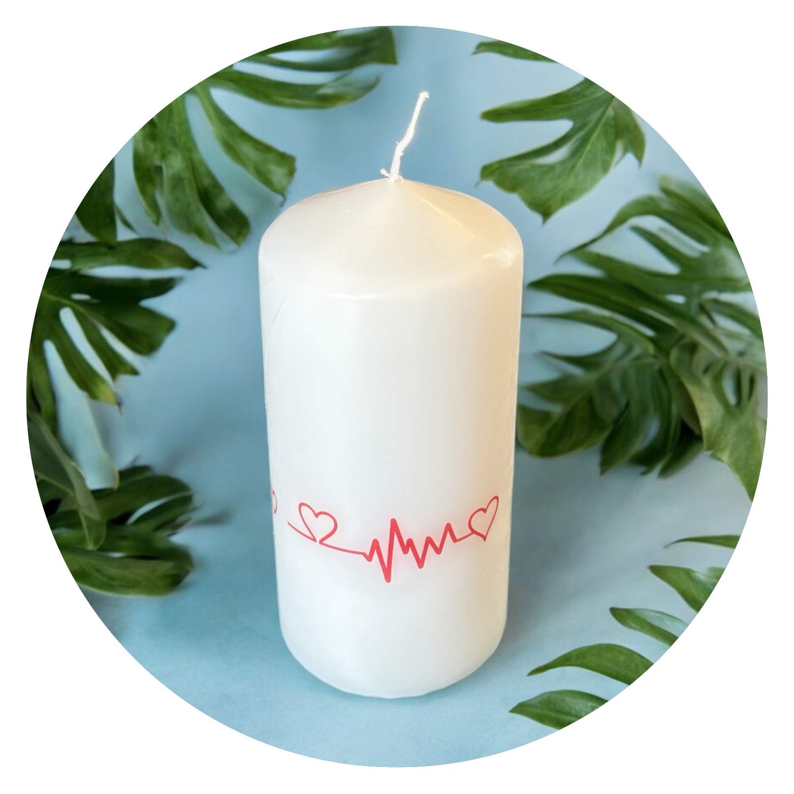 De andere versie heeft een rode opdruk van een hartslag die tussen twee harten klopt. Eigenlijk heeft ook deze geen toelichting nodig, maar deze kaars laat de verbinding zien tussen twee harten.