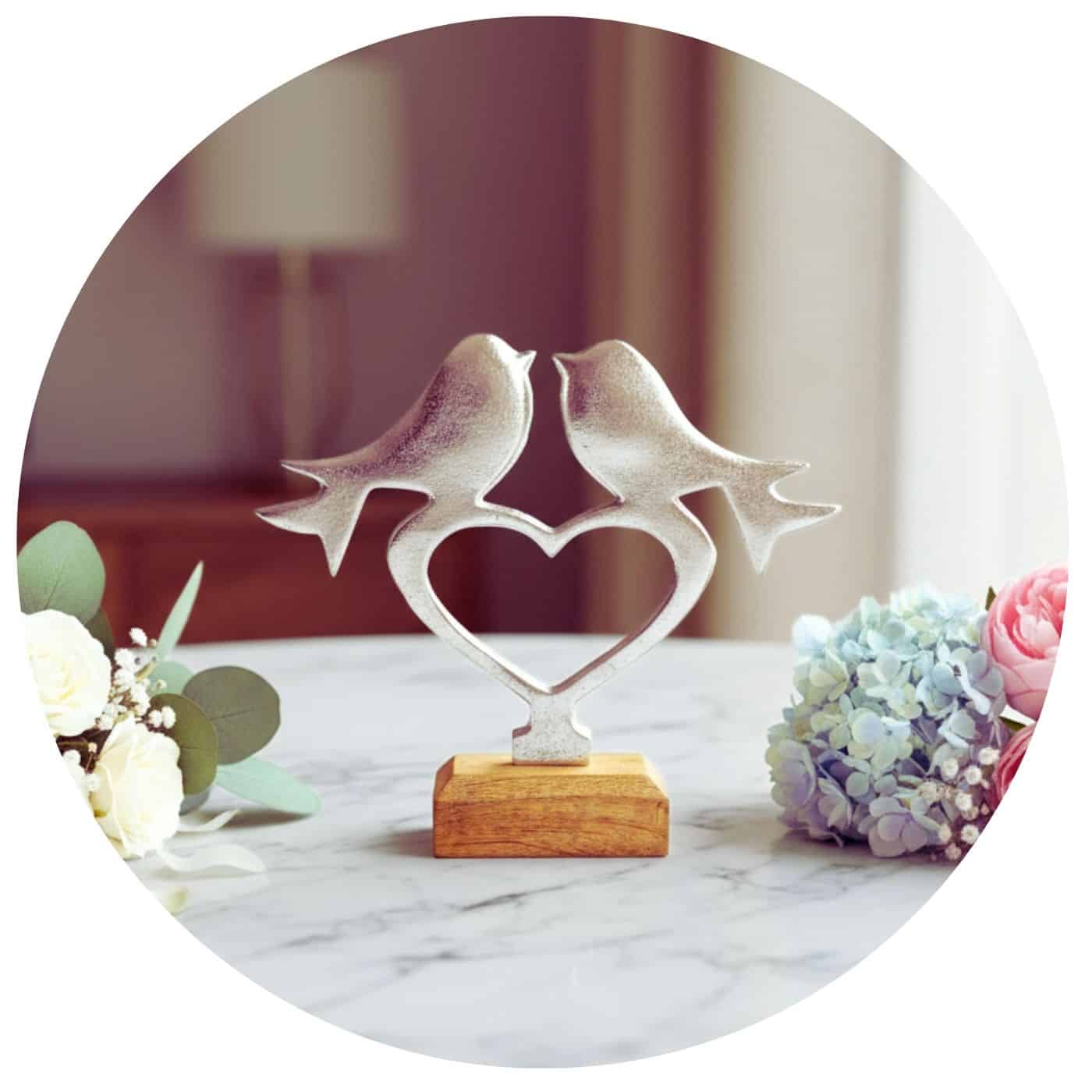 Dit beeldje met twee vogels op een hartje ademt zachtheid en verbondenheid. De vogels leunen liefdevol naar elkaar toe, gedragen door een open hart. Een eenvoudig, maar veelzeggend symbool voor liefde die blijft, ook als iemand niet meer zichtbaar aanwezig is.