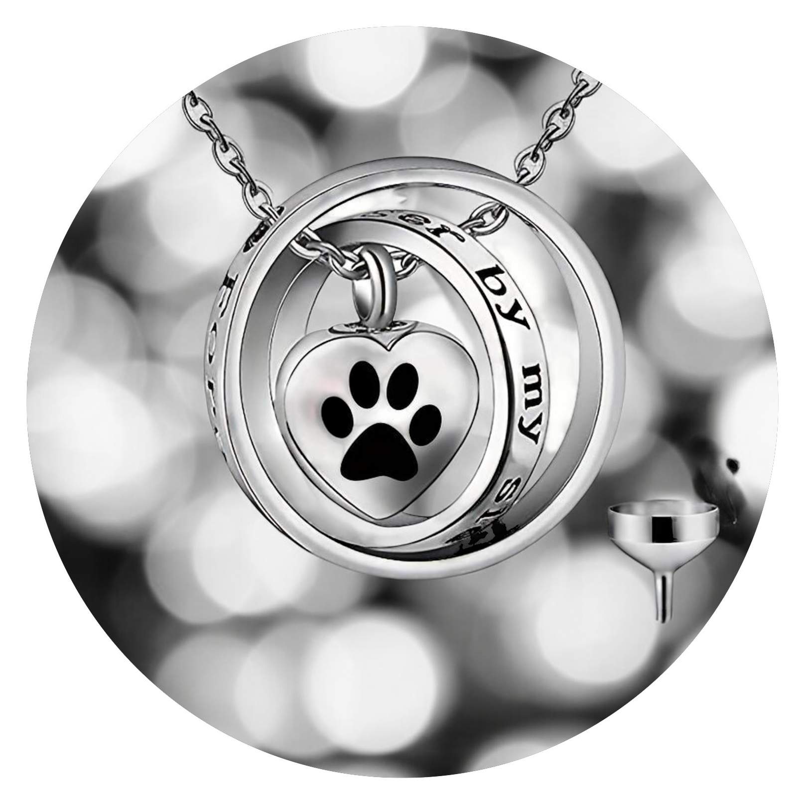 Deze prachtige ketting symboliseert die onvergetelijke band. Twee sierlijke cirkels draaien om elkaar heen, met in het midden een hartje met een pootafdrukje. Op de cirkels staat de troostrijke tekst: *no longer by my side, forever in my heart* – een liefdevolle herinnering aan een vriend die fysiek misschien niet meer bij je is, maar voor altijd in je hart blijft.