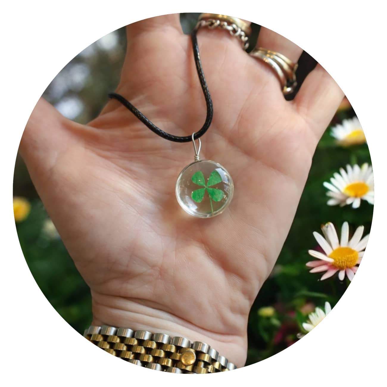 Een echt klavertje vier, gevangen in een elegante ronde hanger aan een stoere zwarte veterketting. Omdat het een echt klavertje is, is geen enkele ketting precies hetzelfde—net als degene die het draagt. Een klavertje, dus een beetje geluk om altijd bij je te hebben, voor iedereen die zijn eigen unieke pad durft of wil volgen.