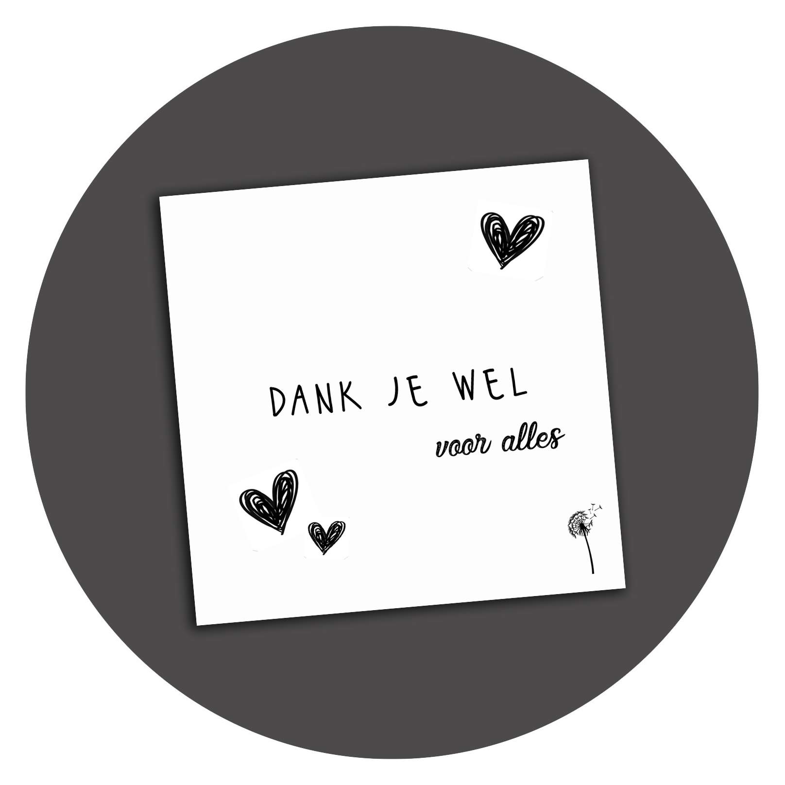 Vierkante kaart Dank Je Wel, 10×10 cm, enkelzijdig bedrukt, 300 grams mat karton, afgewerkt met UV-lak.