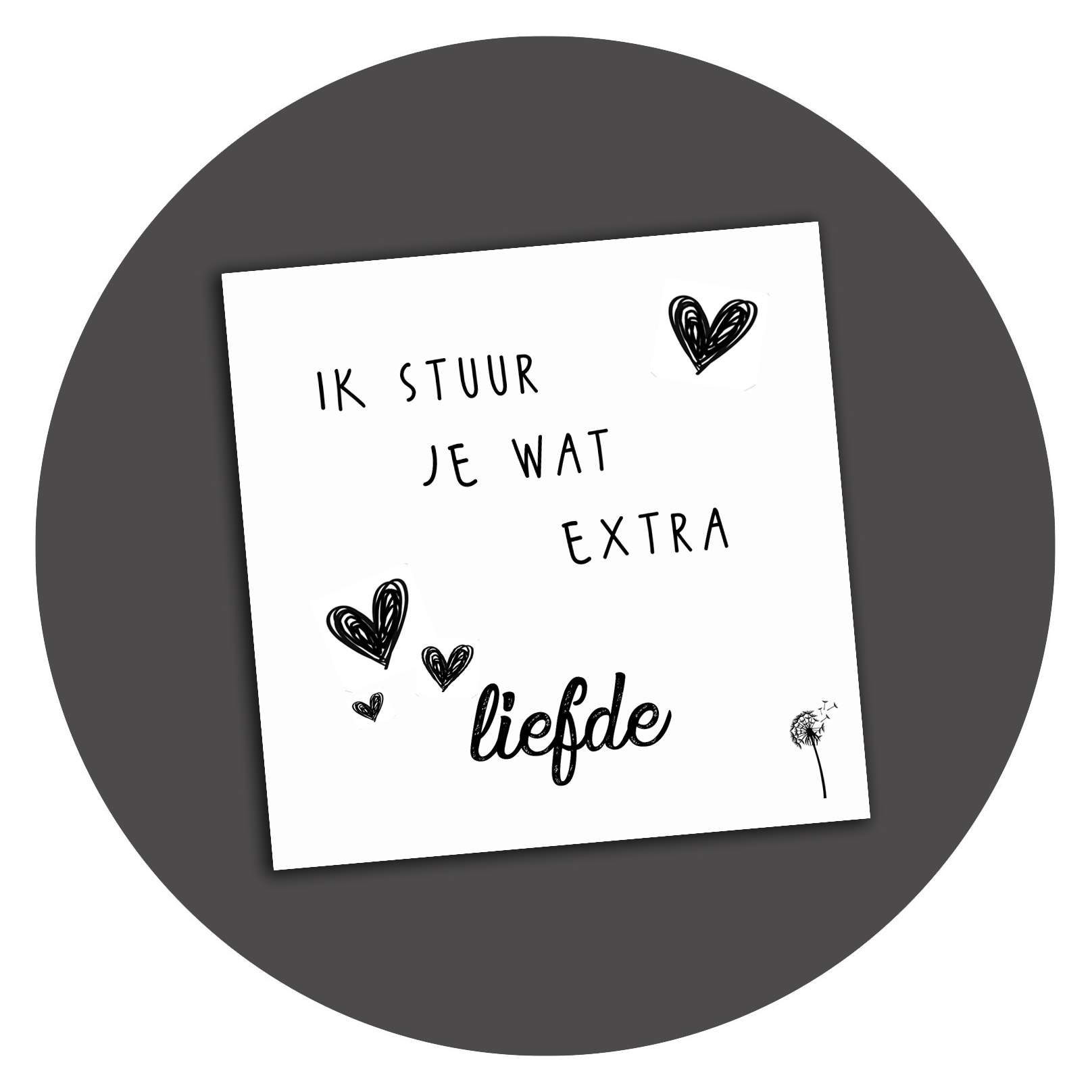 Vierkante kaart Extra Liefde, 10×10 cm, enkelzijdig bedrukt, 300 grams mat karton, afgewerkt met UV-lak.