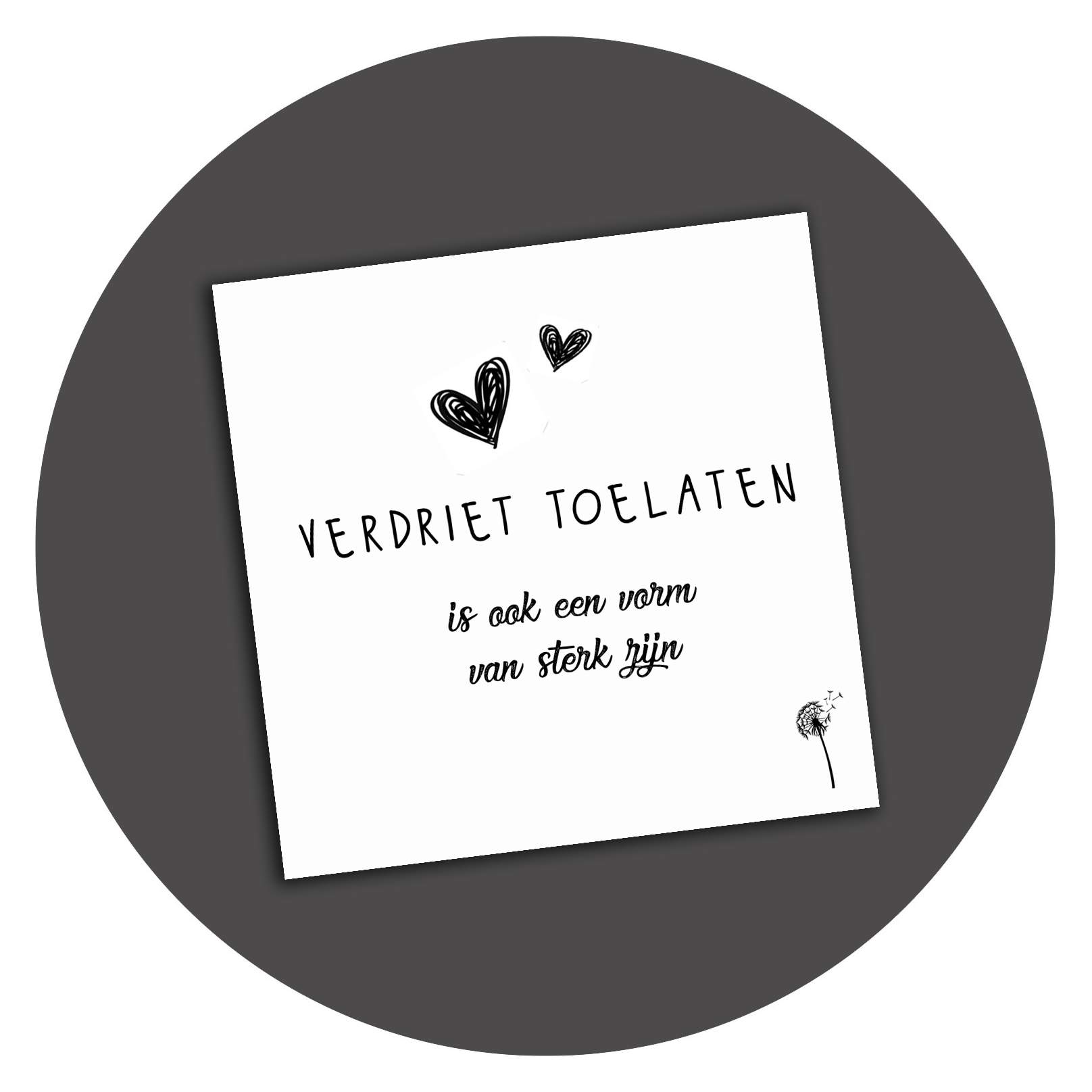Vierkante kaart Verdriet Toelaten Is Ook Een Vorm Van Sterk Zijn, 10×10 cm, enkelzijdig bedrukt, 300 grams mat karton, afgewerkt met UV-lak.