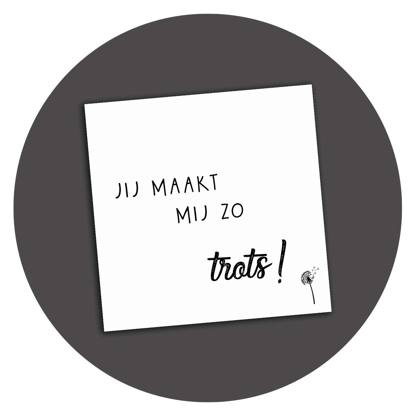 Vierkante kaart Zo Trots, 10×10 cm, enkelzijdig bedrukt, 300 grams mat karton, afgewerkt met UV-lak.
